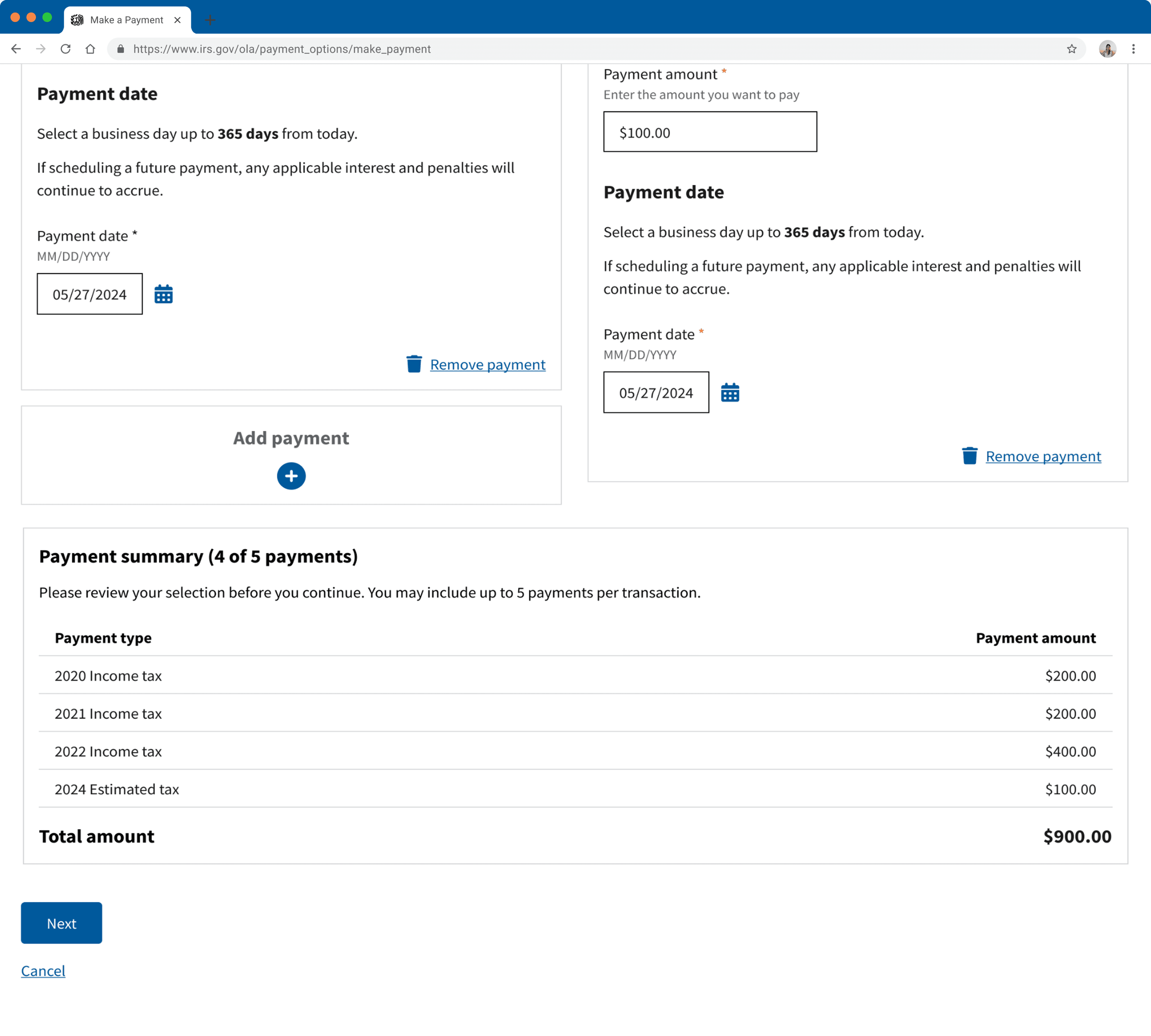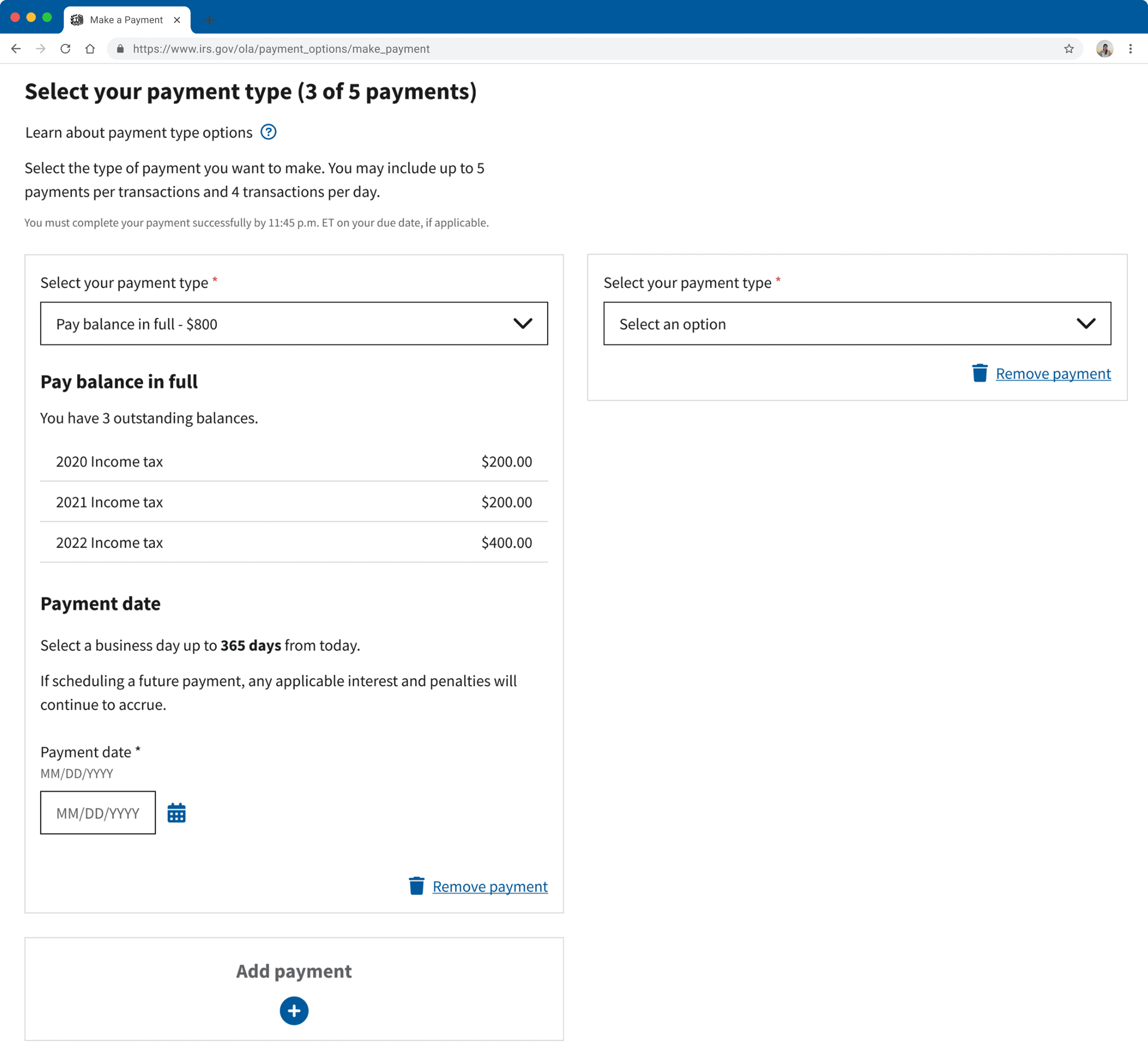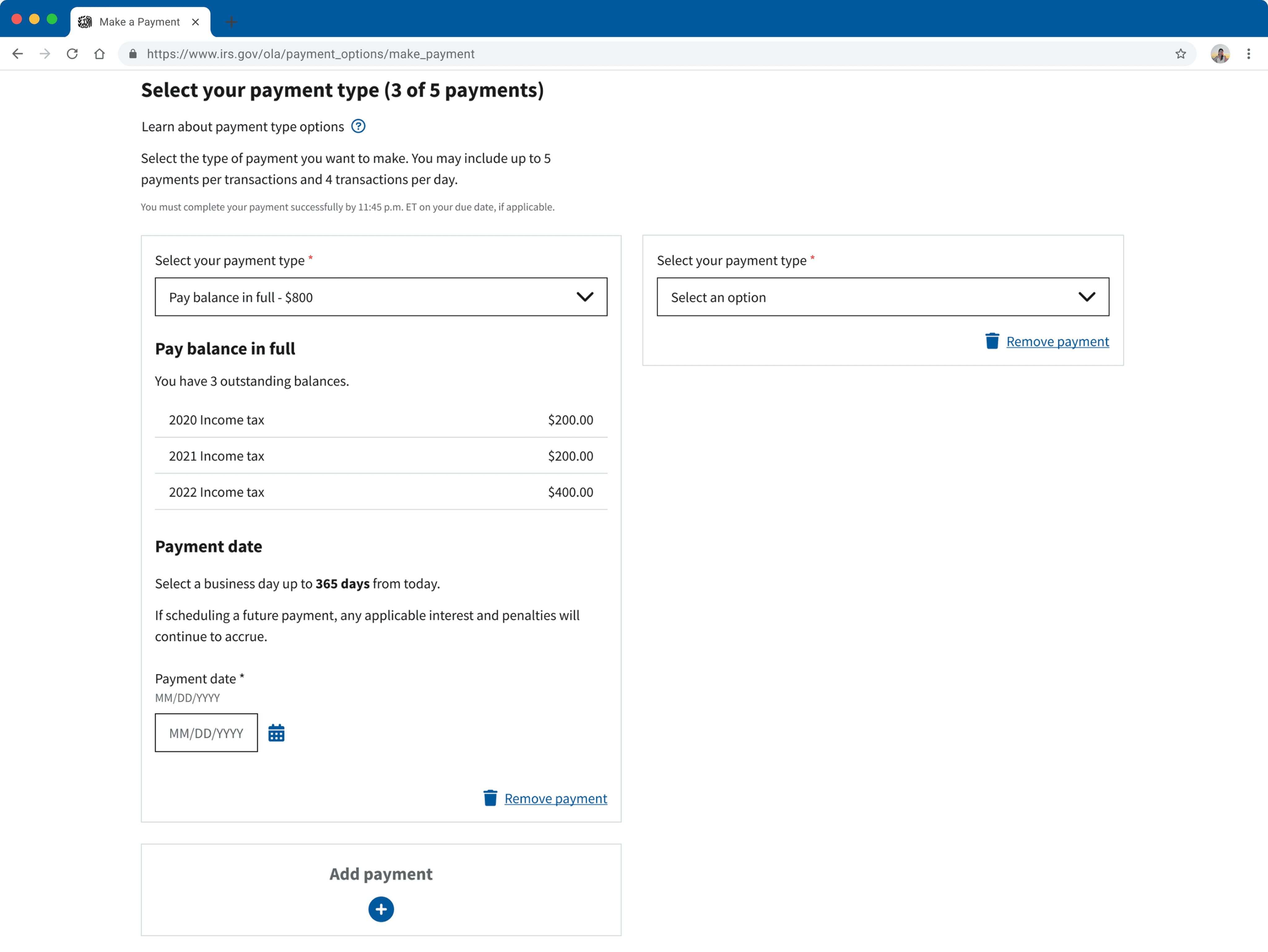 Could only select one choice per session. Only at the bottom of the page, did they mention starting over payments at IRS Direct Pay in order to schedule them.